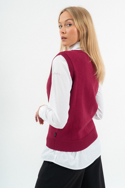 Női vékony kötött mellény. Enyhén szűkített fazon. Fémcímkével díszítve.