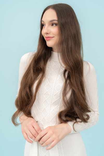 Női vékony kötött ruha. Szűk fazon. Derekán öv. Fémcímkével díszítve.