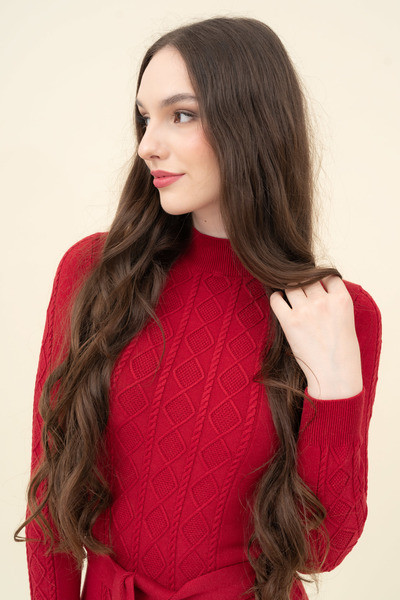 Női vékony kötött ruha. Szűk fazon. Derekán öv. Fémcímkével díszítve.