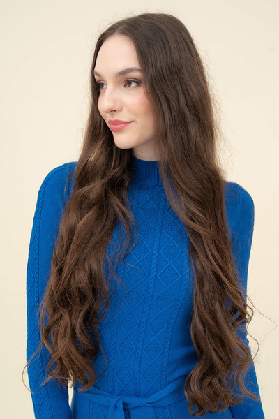 Női vékony kötött ruha. Szűk fazon. Derekán öv. Fémcímkével díszítve.