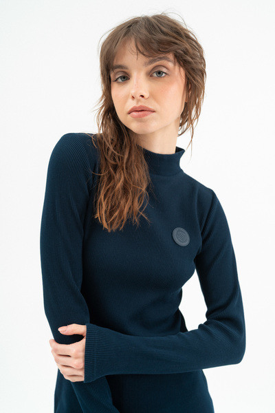 Női ruha rugalmas anyagból. Testhezálló fazon. Gumicímkékkel díszítve.
