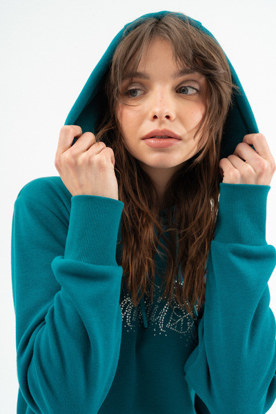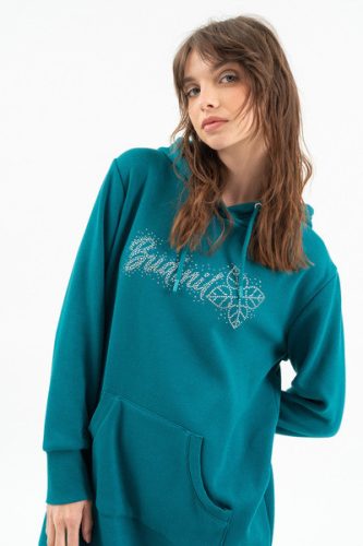Női kapucnis ruha. Alapanyaga belül plüss. Lezser fazon. Strasszokkal díszítve.