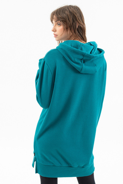 Női kapucnis ruha. Alapanyaga belül plüss. Lezser fazon. Strasszokkal díszítve.