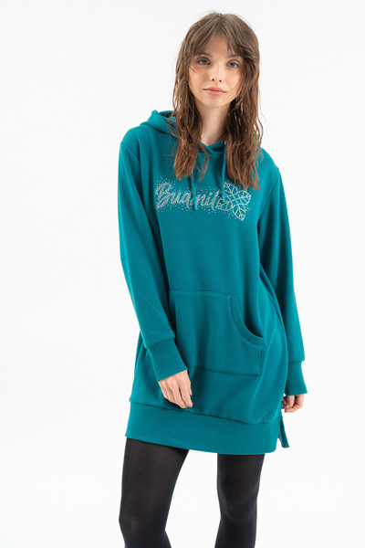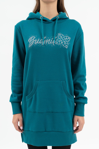 Női kapucnis ruha. Alapanyaga belül plüss. Lezser fazon. Strasszokkal díszítve.
