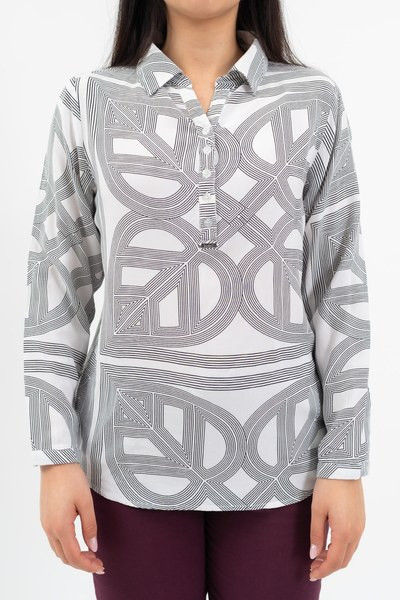 női blúz - lezser fazon - fémcímkével díszítve - FIGYELEM! A nagyméretű nyomott minták egyedileg kerülnek rá minden termékre, így az elhelyezkedésük eltérő lehet a fotón látottól!