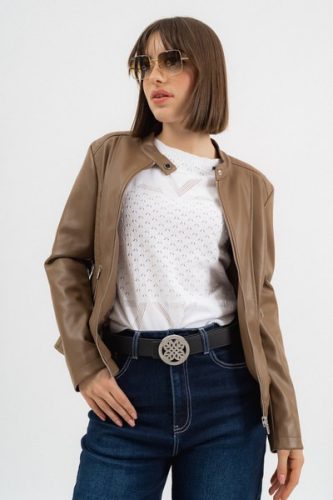 női műbőr dzseki karcsúsított, rövid fazon - fémcímkékkel díszítve <br> <br><p>Ez a <strong>női műbőr dzseki</strong> karcsúsított, rövid fazonjával modern, letisztult megjelenést biztosít. A <strong>karcsúsított szabás</strong> kényelmes illeszkedést ad, miközben kiemeli az alakot. A dzseki visszafogott <strong>fémcímkés díszítéssel</strong> készül, amely egységes, letisztult összhatást eredményez.</p>