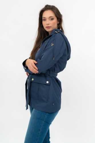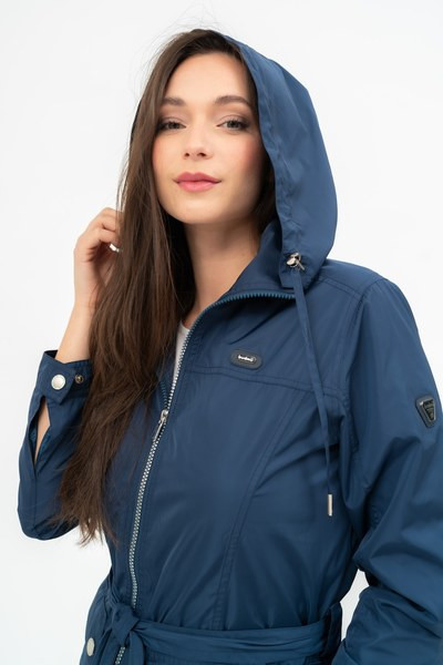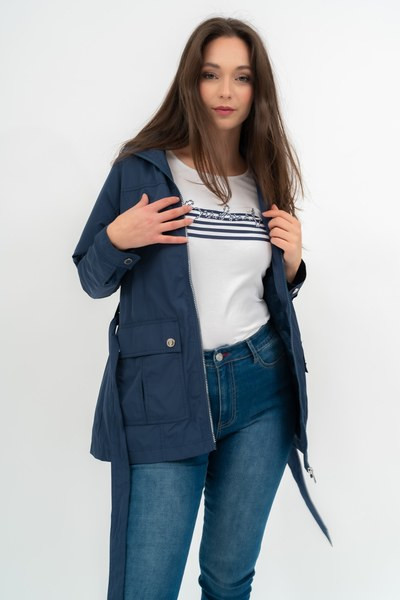 női dzseki - hosszított fazon - derekán övvel - kapucni a gallérban - fémcímkével díszítve