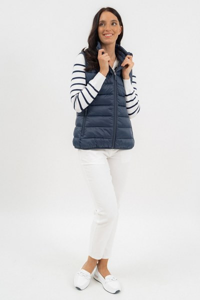 női steppelt vékony mellény anyaga vízlepergető - enyhén karcsúsított fazon - belső zsebek - gumicímkékkel díszítve<br> <br><p>Ez a <strong>női steppelt vékony mellény</strong> praktikus és stílusos választás az átmeneti időszakra. A <strong>vízlepergető anyag</strong> védelmet nyújt a kisebb eső és a szél ellen, míg az <strong>enyhén karcsúsított fazon</strong> nőies sziluettet biztosít.