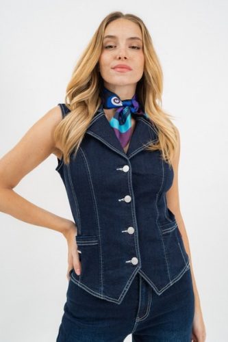 női farmermellénykarcsúsított fazon - fémcímkékkel díszítve - A termék a divatos, intenzív festés miatt, az első pár mosás alkalmával eresztheti a színét, ezért ajánlott elkülönítve mosni. - A kopás elkerülésének érdekében érdemes kifordítva mosni. - <br> <br> <p>