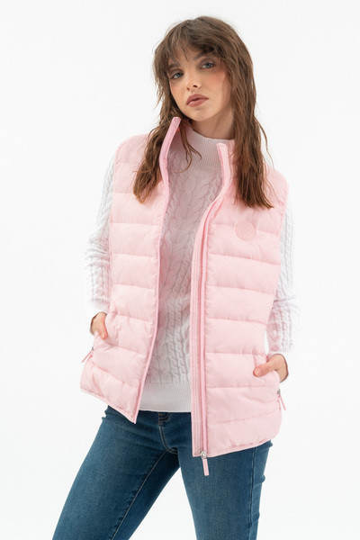 Női steppelt vékony mellény. Enyhén karcsúsított fazon. Belső zsebek. Gumicímkékkel díszítve.