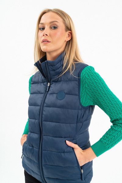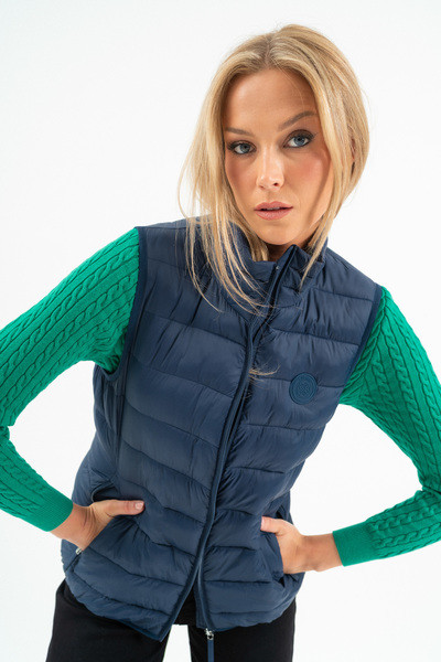 Női steppelt vékony mellény. Enyhén karcsúsított fazon. Belső zsebek. Gumicímkékkel díszítve.