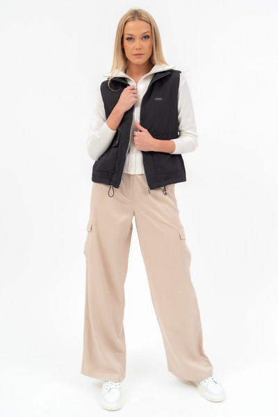 Női rövid fazonú vékony mellény. Polár anyaggal bélelve. Fémcímkével díszítve.