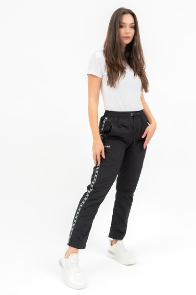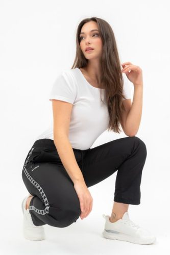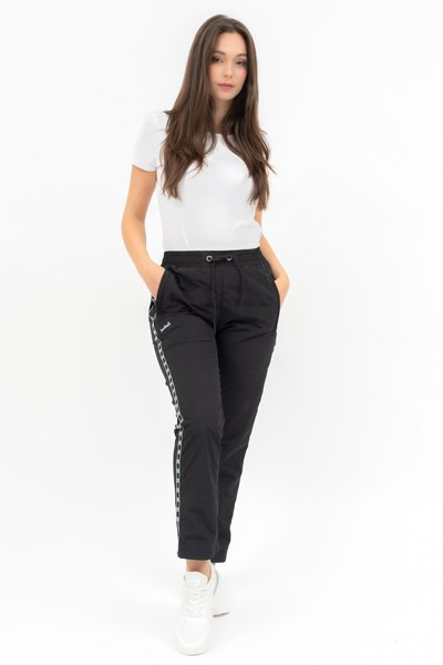 női szabadidőnadrág szövött mikroszálas anyagból - béleletlen - alja egyenes - hímzéssel és szövött szalaggal díszítve