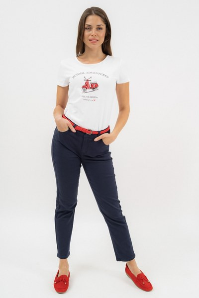 női hosszúnadrág szövött anyagból push-up fazon - derekán keskeny fonott övvel - fémcímkével vagy hímzéssel díszítve<br> <br><p>