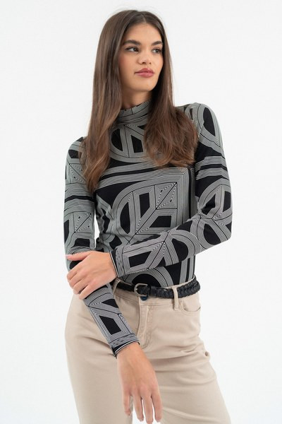 női vékony magas nyakú felső - rugalmas anyagból - szűk fazon - fémcímkével díszítve - FIGYELEM! A nagyméretű nyomott minták egyedileg kerülnek rá minden termékre, így az elhelyezkedésük eltérő lehet a fotón látottól!