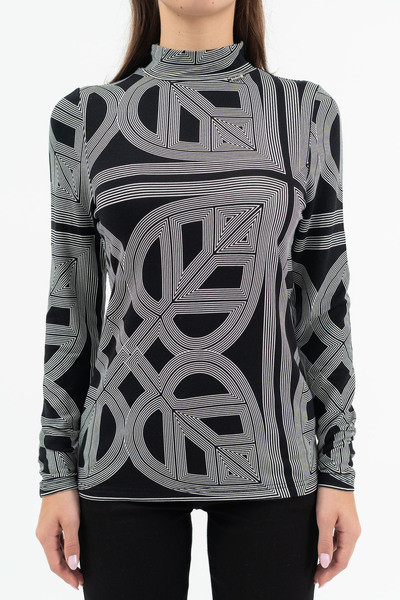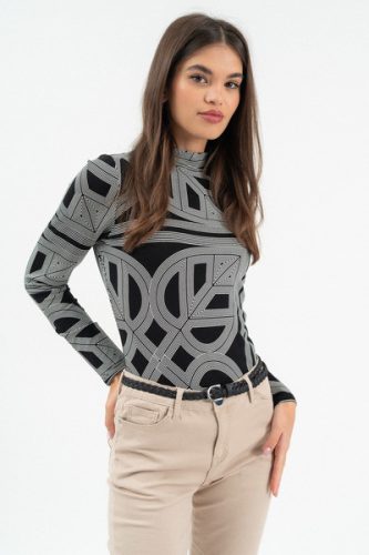 Női vékony magas nyakú felső . Rugalmas anyagból. Szűk fazon. Fémcímkével díszítve. FIGYELEM! A nagyméretű nyomott minták egyedileg kerülnek rá minden termékre, így az elhelyezkedésük eltérő lehet a fotón látottól!.