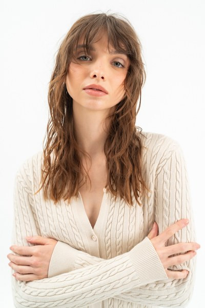 bézs színű Budmil kötött pulóver - 20050828-001 női pulóver. Felsőrészének az anyaga: 50% viszkóz-30% poliészter-20% poliamid