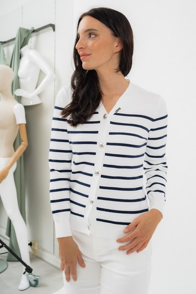 fehér-s.kék színű Budmil kötött pulóver - 20050840-001 női pulóver. Felsőrészének az anyaga: 50% viszkóz-30% poliészter-20% poliamid