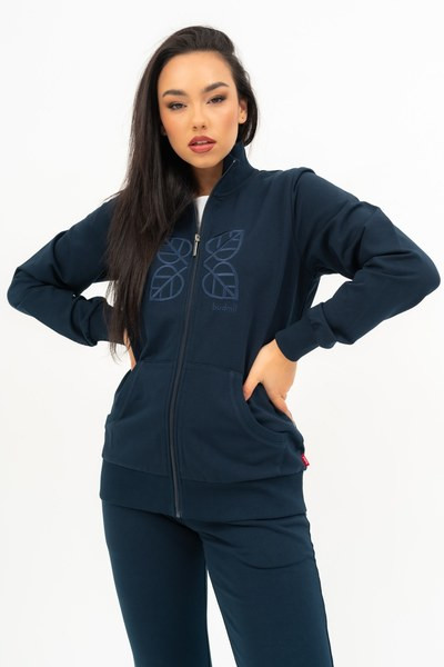 női szabadidőfelső rugalmas anyagból - alapanyaga belül bolyhozatlan - hímzéssel díszítve