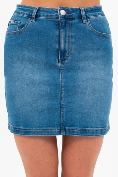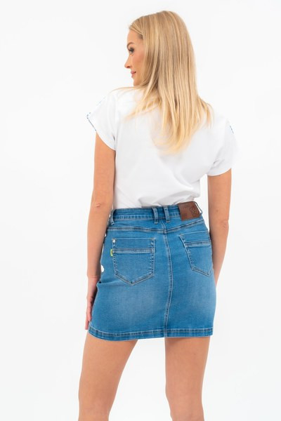 női farmer miniszoknya - fém és műbőr címkével díszítve
