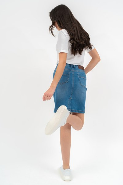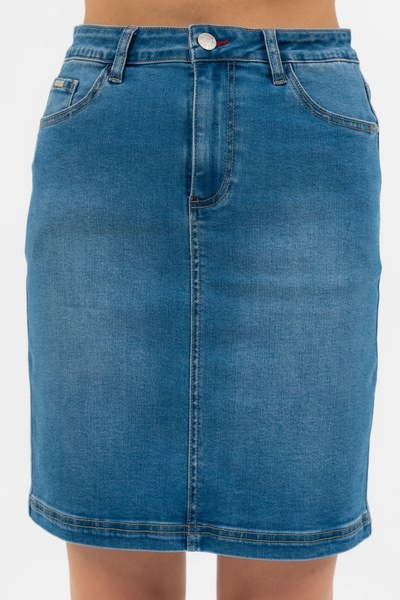 női farmerszoknya - fém és műbőr címkével díszítve