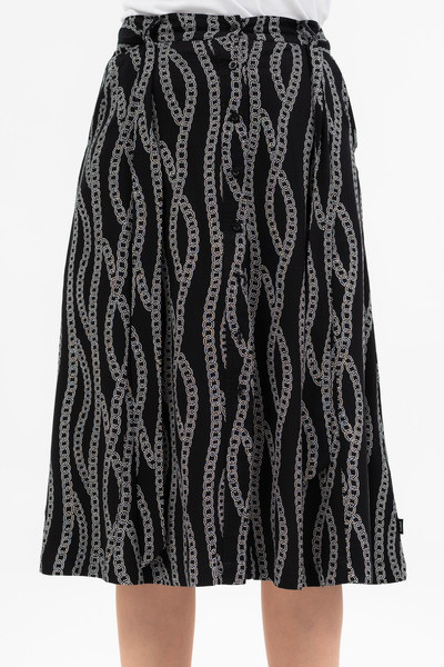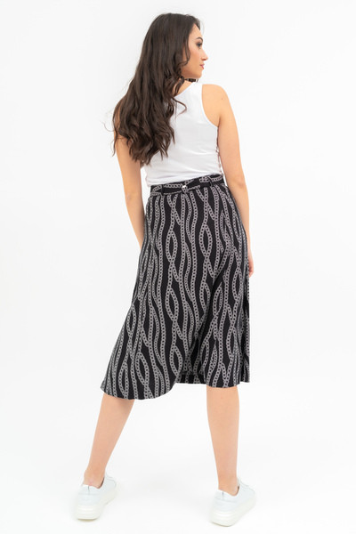 Női szoknya szövött anyagból. Gumis derékrésszel, övvel. Fémcímkével díszítve.