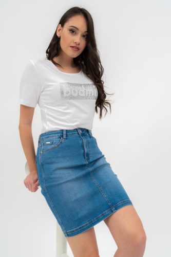Női farmerszoknya . Fém és műbőr címkével díszítve.