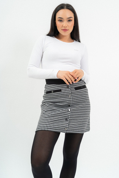 Női szoknya rugalmas anyagból. A vonalú rövid fazon. Fémcímkével díszítve.