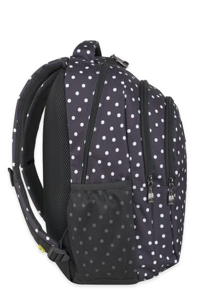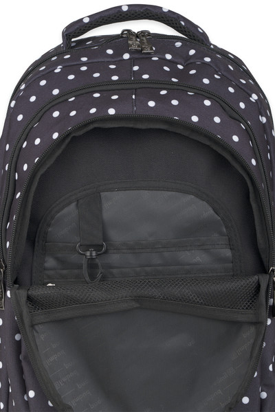 30x43x20 cm, 26L. Alapanyaga vízlepergető. Mindkét oldalán hálós kulacstartó zseb. Légcsatornás hátlap. Három különálló cipzáros rekesz. Az első rekeszben rendszerező zsebek.