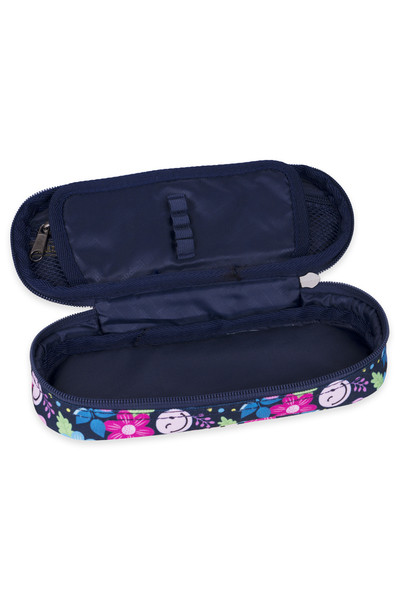 22,2x9 cm. Egyrekeszes kisméretű tolltartó. Alapanyaga vízlepergető. Virágos mintával. Belül cipzáros hálós zsebbel. Kihajtható ceruzatartó 8 ceruzahellyel.