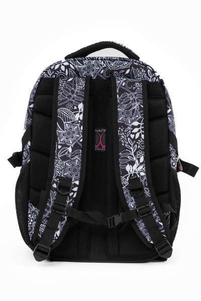 33x46x21cm, 0,87 kg. Alapanyaga vízlepergető. Mindkét oldalán hálós kulacstartó zseb. Légcsatornás hátlap. Három különálló cipzáros rekesz. Az első rekeszben rendszerező zsebek. Laptoptartó: 30X40cm.