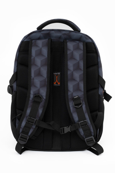 33x46x21cm, 0,87 kg. Alapanyaga vízlepergető. Mindkét oldalán hálós kulacstartó zseb. Légcsatornás hátlap. Három különálló cipzáros rekesz. Az első rekeszben rendszerező zsebek. Laptoptartó: 30X40cm.
