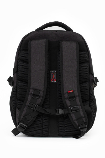 33x46x21cm, 0,87 kg. Alapanyaga vízlepergető. Mindkét oldalán hálós kulacstartó zseb. Légcsatornás hátlap. Három különálló cipzáros rekesz. Az első rekeszben rendszerező zsebek. Laptoptartó: 30X40cm.