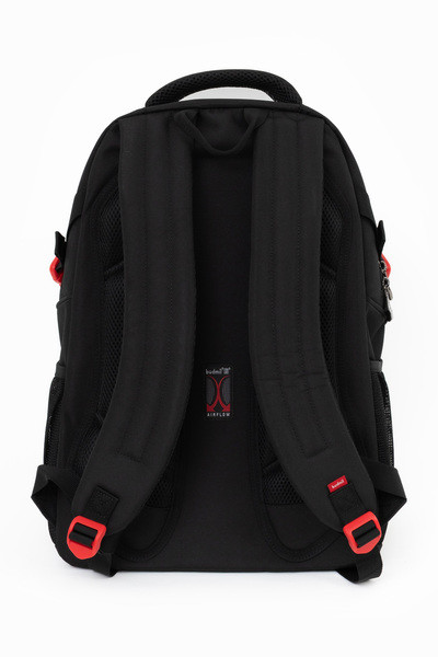 32x47x16 cm, 0,96 kg. Alapanyaga vízlepergető. Mindkét oldalán hálós kulacstartó zseb. Légcsatornás hátlap. Három különálló cipzáros rekesz. Az első rekeszben rendszerező zsebek. Laptoptartó: 26 X 38 cm.