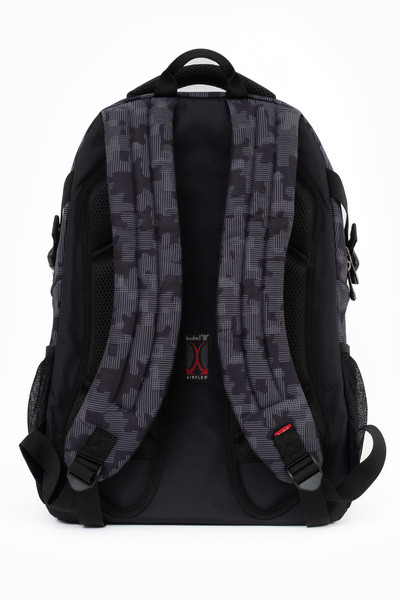 32x47x16 cm, 0,96 kg. Alapanyaga vízlepergető. Mindkét oldalán hálós kulacstartó zseb. Légcsatornás hátlap. Három különálló cipzáros rekesz. Az első rekeszben rendszerező zsebek. Laptoptartó: 26 X 38 cm.