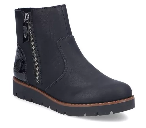 Fekete színű Rieker 44950-00 női bokacsizma. Felsőrészének az anyaga: műbőr felső