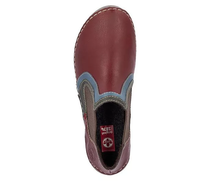 Bordó színű Rieker 52599-35 női bokacsizma. Felsőrészének az anyaga: műbőr felső