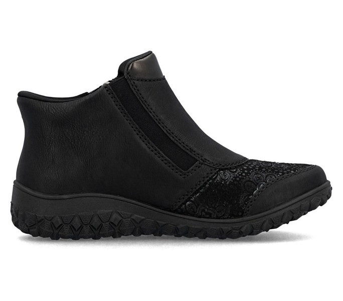 Fekete színű Rieker 59558-00 női bokacsizma. Felsőrészének az anyaga: Ekológikus bőr/textil felső