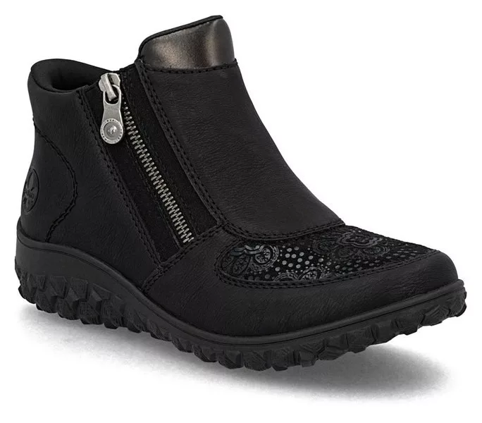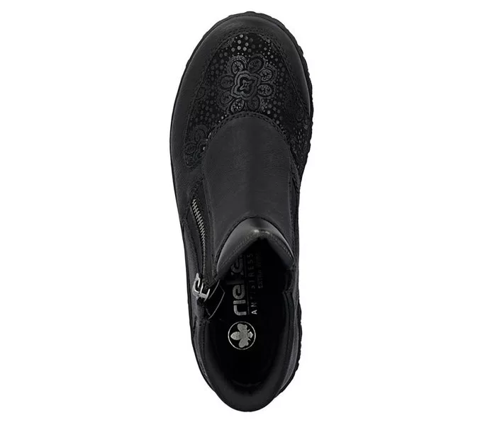 Fekete színű Rieker 59558-00 női bokacsizma. Felsőrészének az anyaga: Ekológikus bőr/textil felső