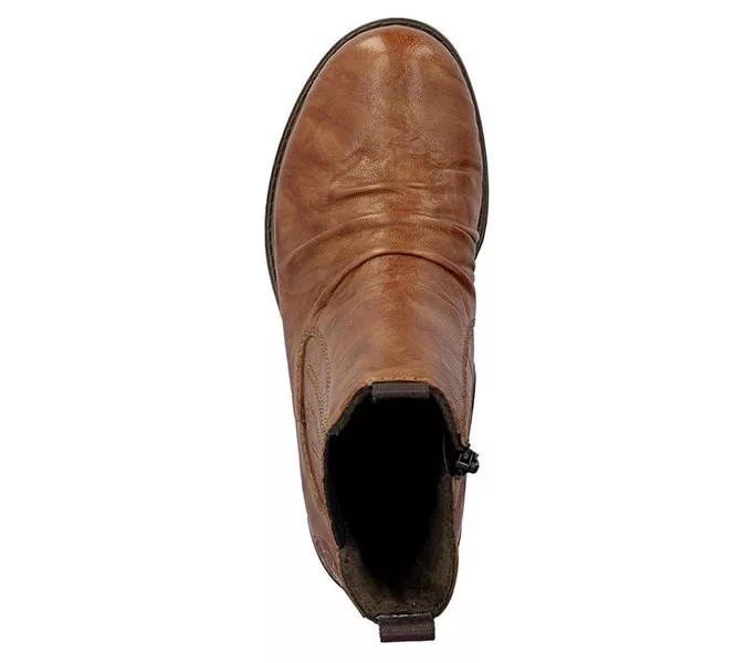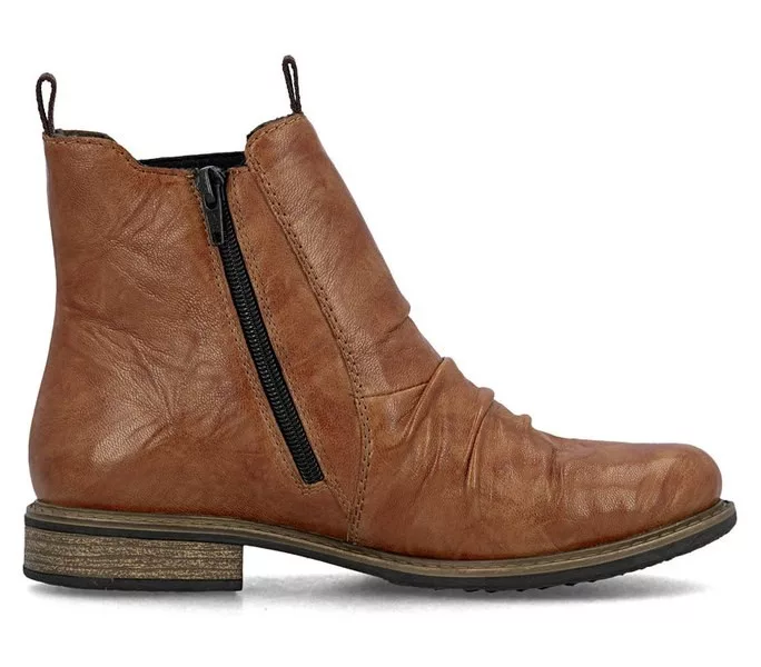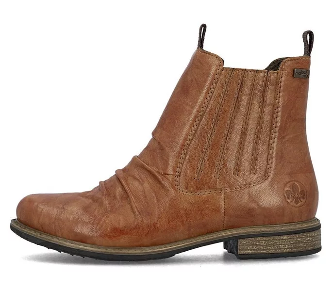 Barna színű Rieker 74855-22 női bokacsizma. Felsőrészének az anyaga: Bőr felső
