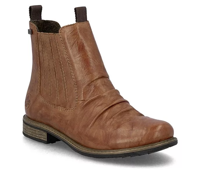 Barna színű Rieker 74855-22 női bokacsizma. Felsőrészének az anyaga: Bőr felső