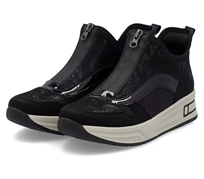 Fekete színű Rieker N8151-00 női bokacsizma. Felsőrészének az anyaga: Szintetikus felső