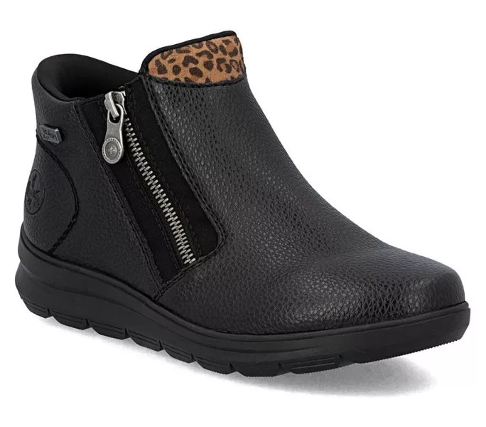 Fekete színű Rieker Z0059-00 női bokacsizma. Felsőrészének az anyaga: Ekológikus bőr felső