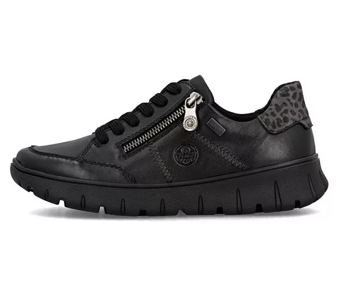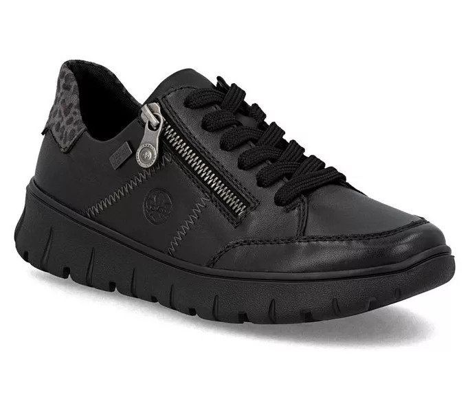Fekete színű Rieker N1301-01 női cipő. Felsőrészének az anyaga: bőr felső