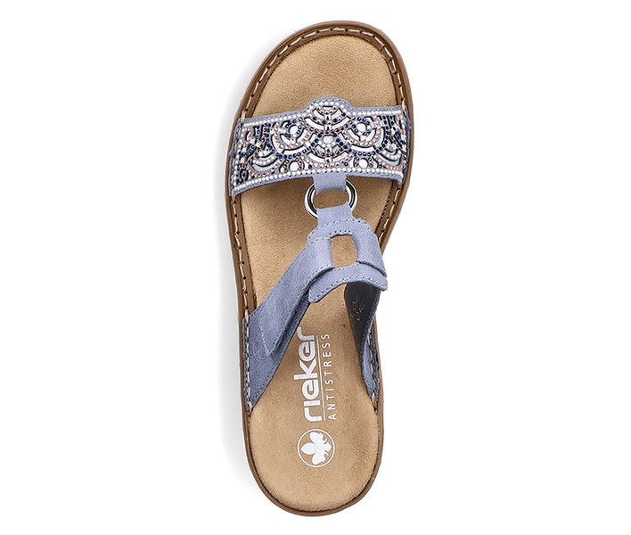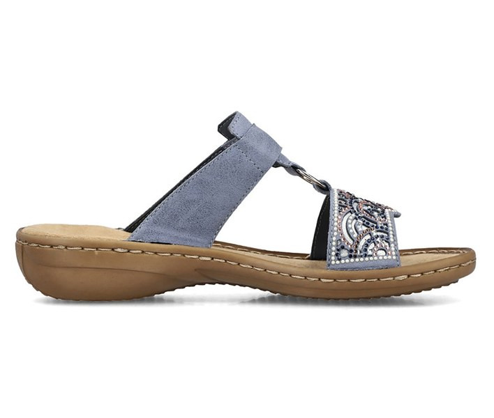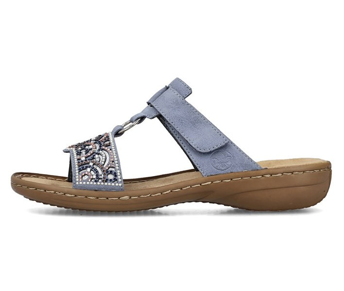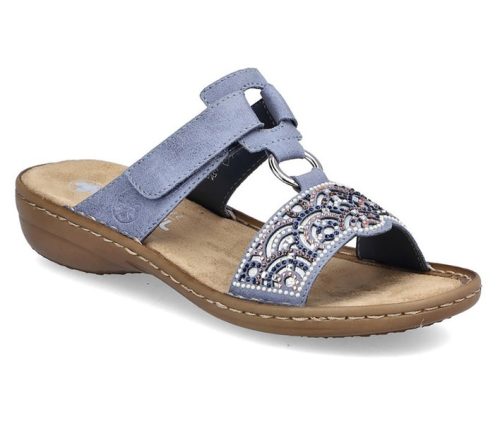 Kék színű Rieker 608K2-12 női papucs. Felsőrészének az anyaga: textil felső