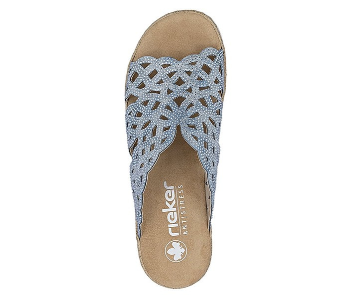 Kék színű Rieker V0689-12 női papucs. Felsőrészének az anyaga: